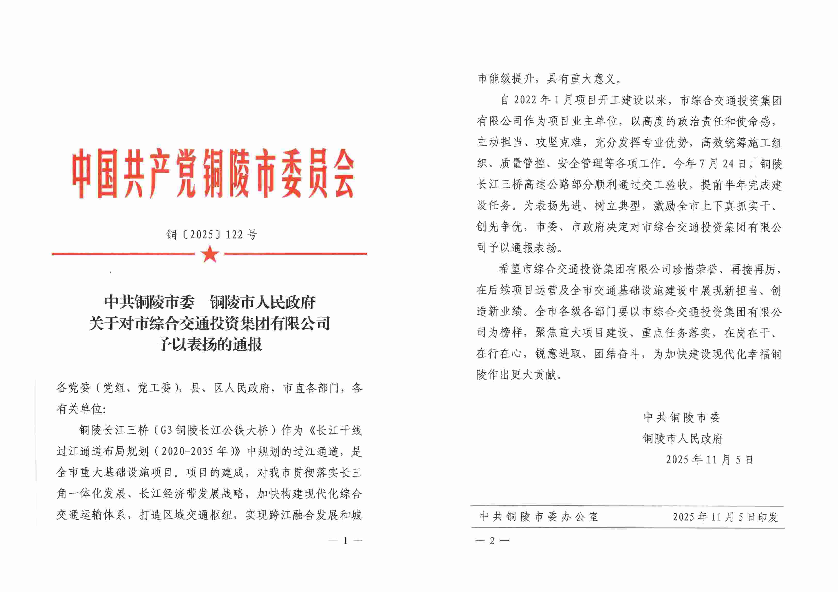 2025年11月6日,由市交投集團投資建設的世界首座公鐵兩用雙層斜拉—懸索協作體系大橋——銅陵長江三橋正式通車運營。市交投集團自大橋2022年1月開工以來,以高度的政治責任感攻堅克難,高效統籌施工組織、質量與安全管理,推動大橋高速公路部分提前半年通過交工驗收,獲中共銅陵市委、銅陵市人民政府通報表彰。