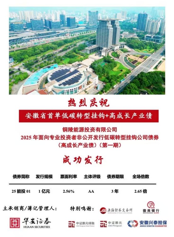 12月19日,銅陵市能源投資有限公司(以下簡稱“銅陵能投公司”)在上海證券交易所成功發(fā)行2025年第一期低碳轉(zhuǎn)型掛鉤公司債券“25能投01”。本次發(fā)行是安徽省首單低碳轉(zhuǎn)型掛鉤公司債+高成長產(chǎn)業(yè)債,也是銅陵能投公司在資本市場的首次亮相,額度3億元,本期發(fā)行1億元。期限3年,票面利率2.56%,全場認(rèn)購倍數(shù)2.65倍。債券票面利率較1年期貸款市場報價利率3.0%下降44個基點,綜合節(jié)約融資成本約132萬元,標(biāo)志著銅陵能投公司成功將金融創(chuàng)新、綠色發(fā)展以及產(chǎn)業(yè)轉(zhuǎn)型深度融合,獲得債券市場投資者的踴躍認(rèn)購。